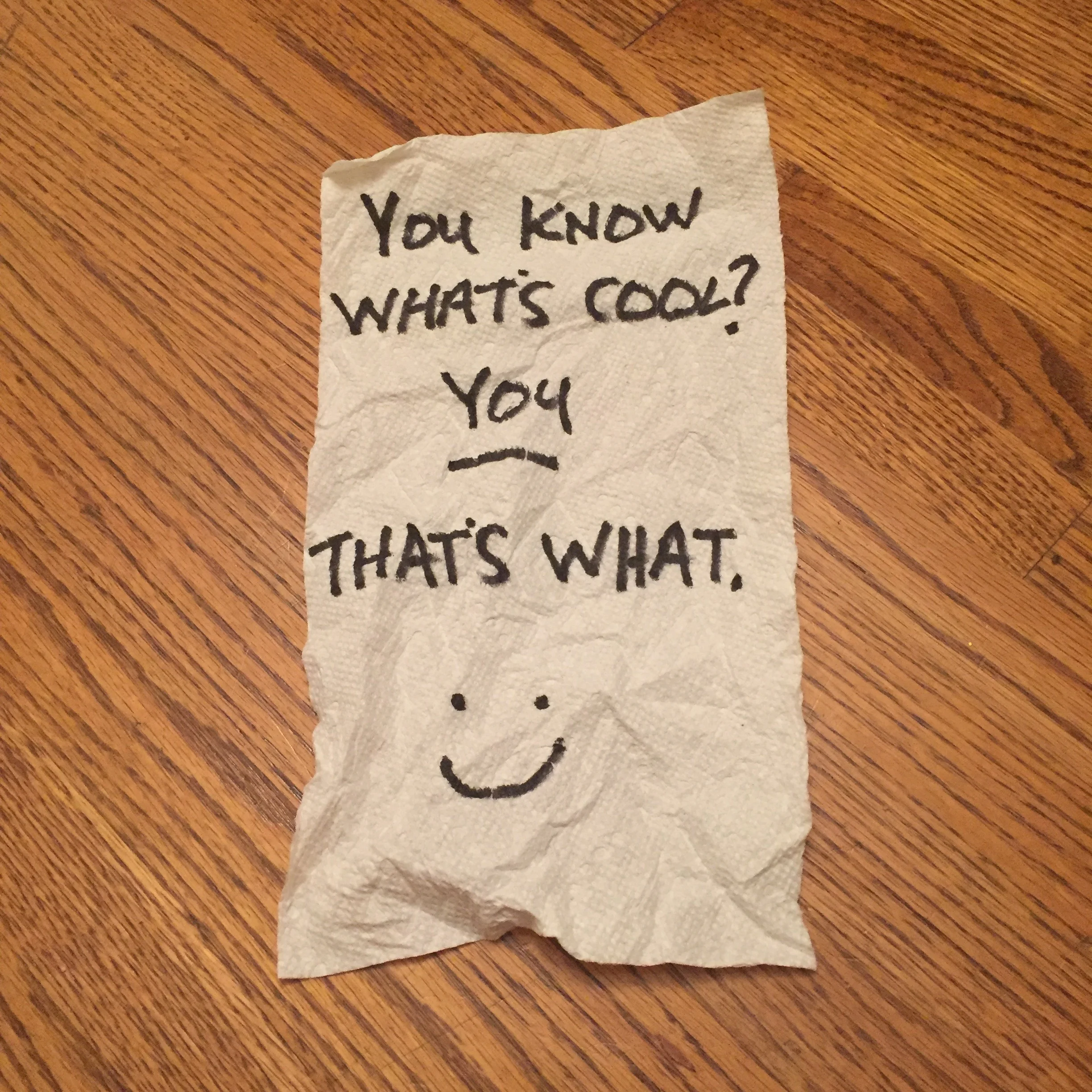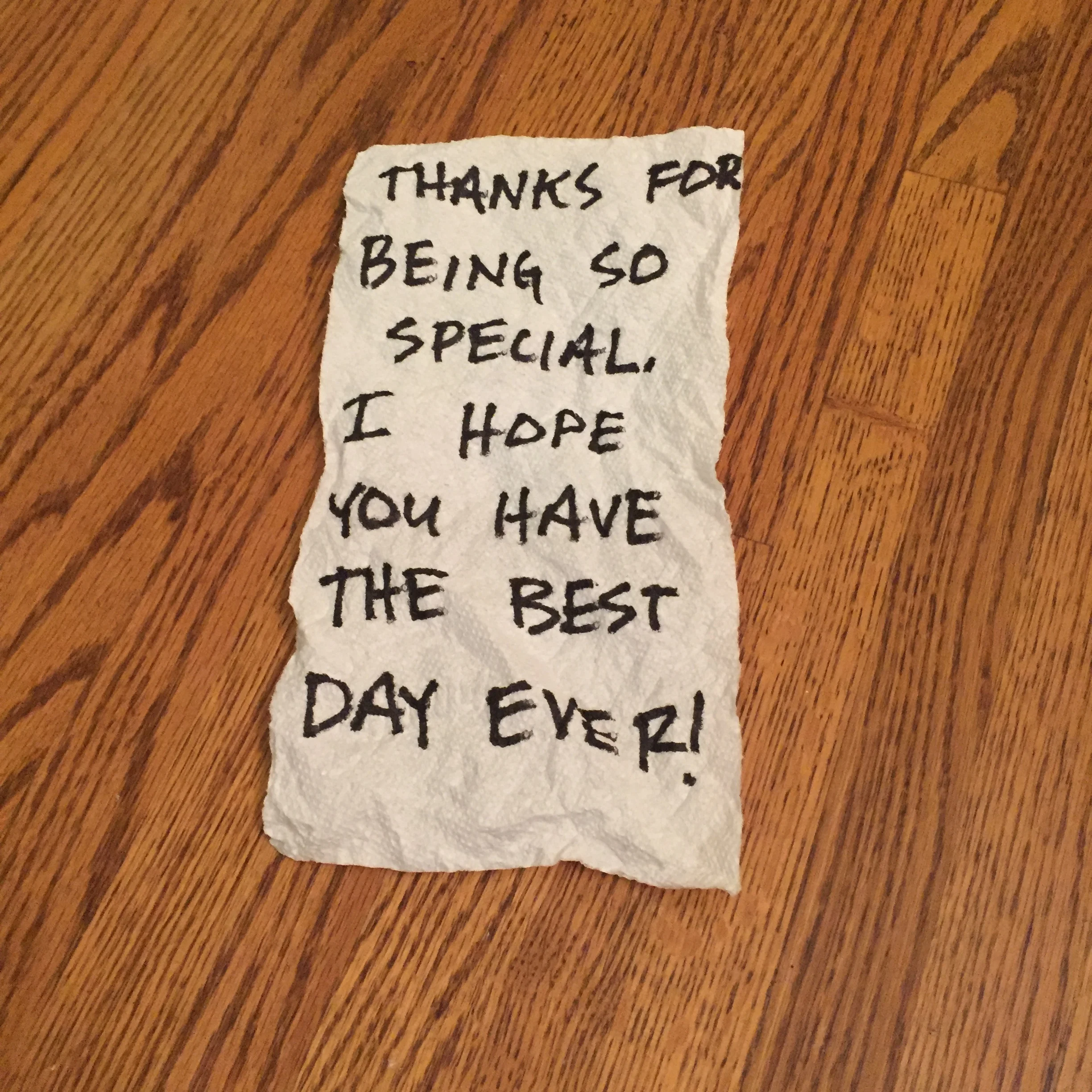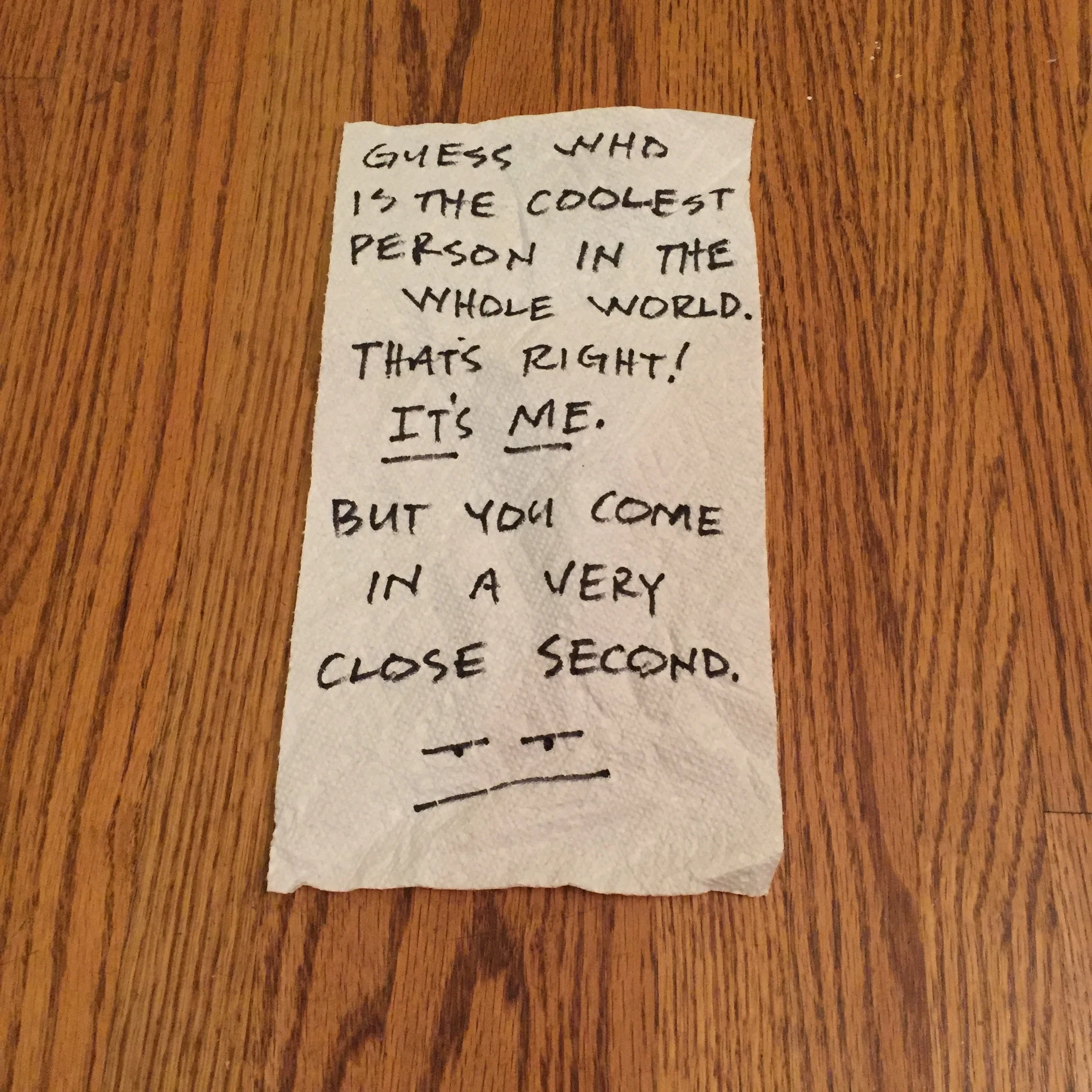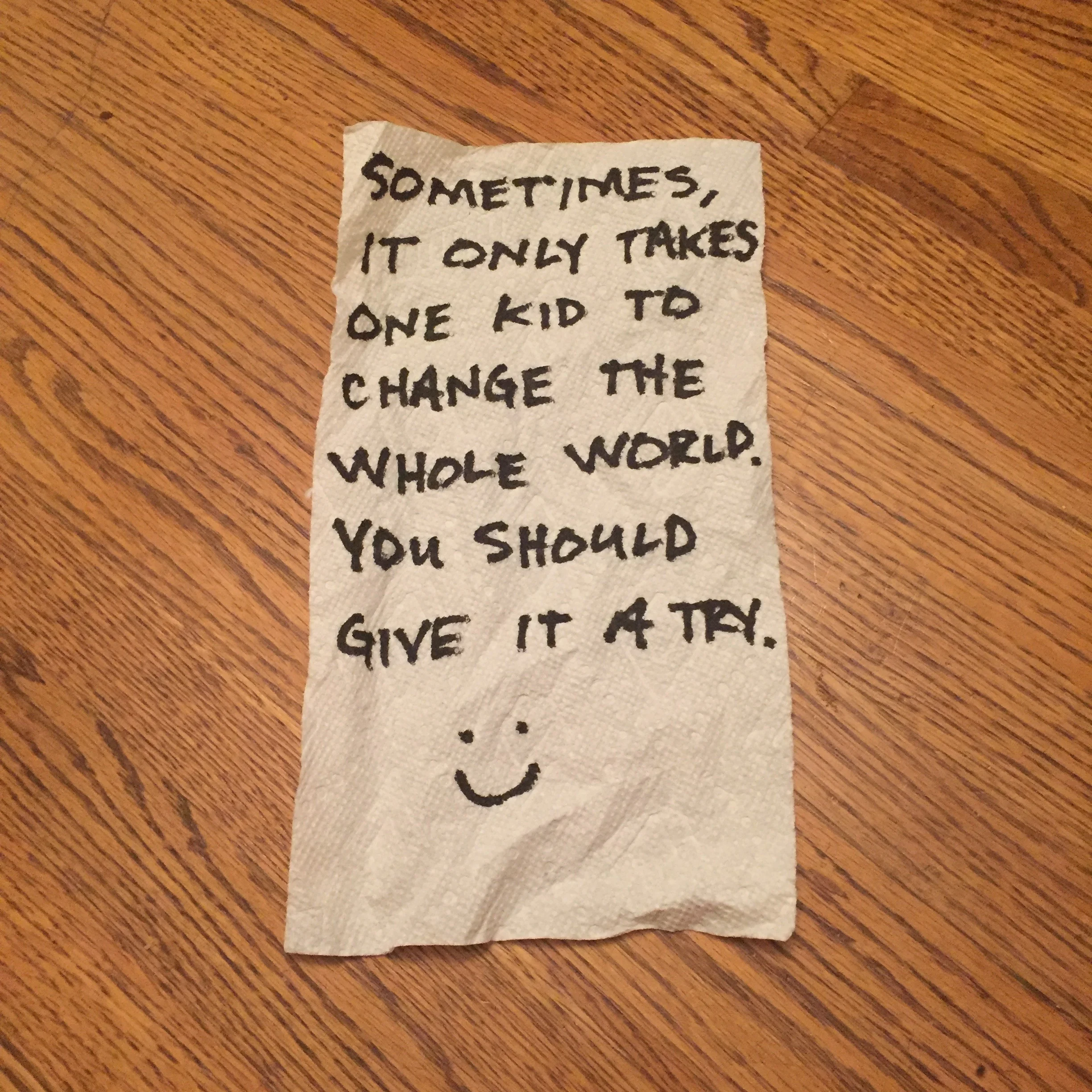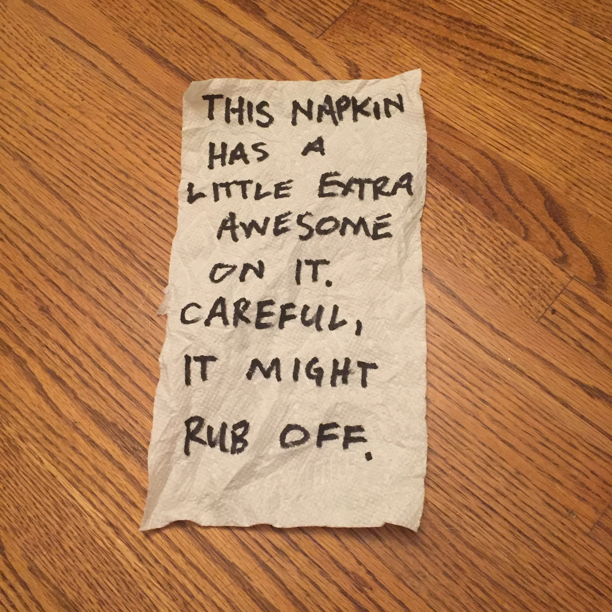 When you submit a Napkinism message, I will write the note on a napkin, post an image, share the image, and then save your note to share with a kid in need.